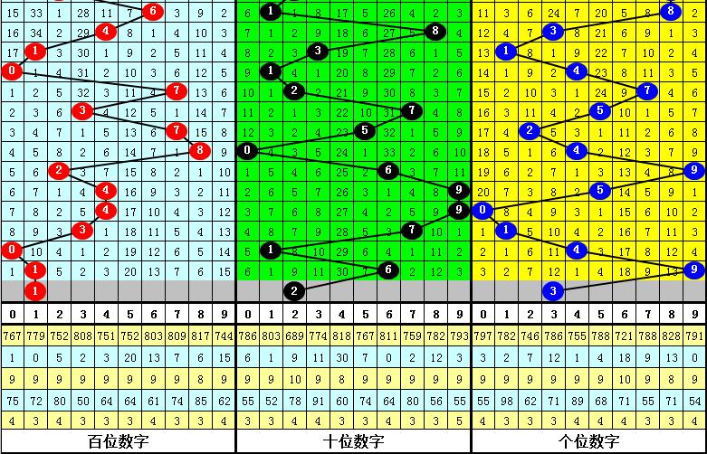 (2)在号码频次方面,开出个数最少的三个号码为:3、5、6,一般来说这三个号码不会同时出现,本期杀一码5;开出个数最多的四个号码分别为:1、2、9、7,本期看好这四个号码中包含1-2个开奖号码,胆码参考7。2。