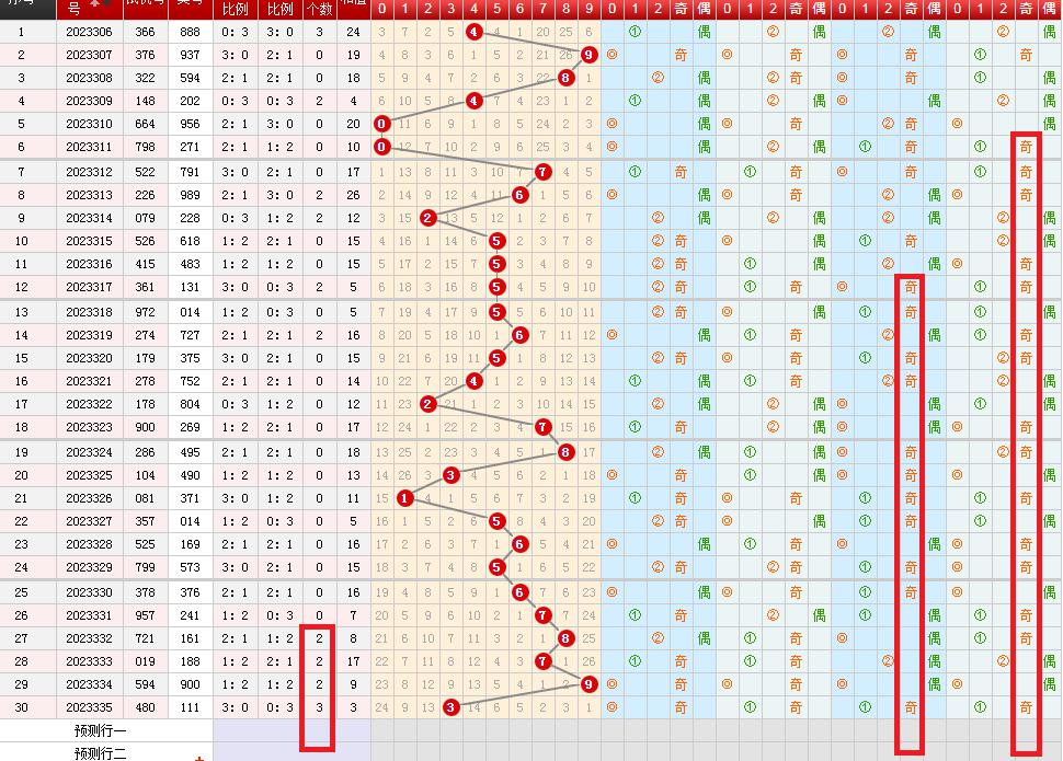 近三十期分别开出16期和值奇,14期和值偶,和值奇偶大致均衡。近5期开出4期和值奇,1期和值偶。上期开出和值奇,按近期跟随表现,故本期和值奇偶难定。