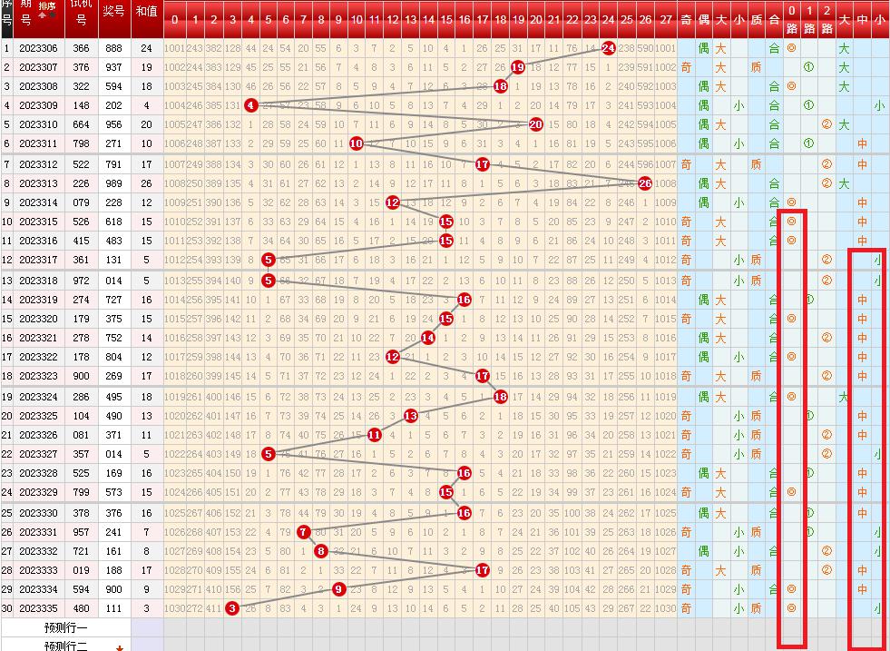 按大(14-27)小(0-13)分,上期开出小数和值,这是连续两期开出,按近期跟随表现,本期大和值可能性大些,但也需要适当防小和值。