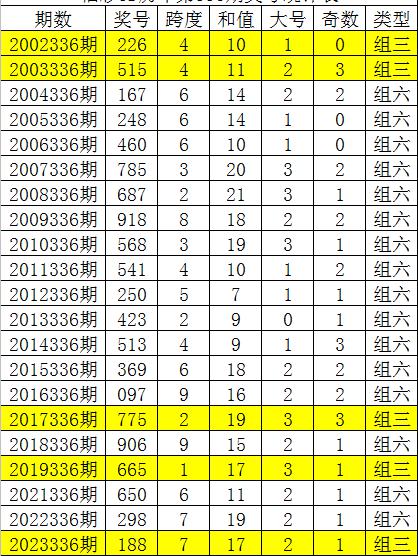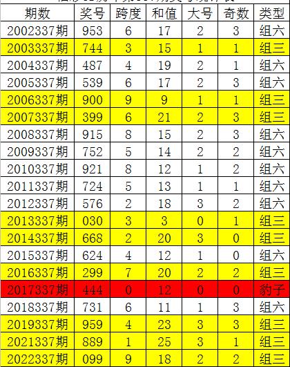 从以上统计可以看出,历年3D第337期开出了1次豹子号码,开出了9次组三号码,开出了10次组六号码。组六号码表现相对较冷,本期预计开出组六号码。