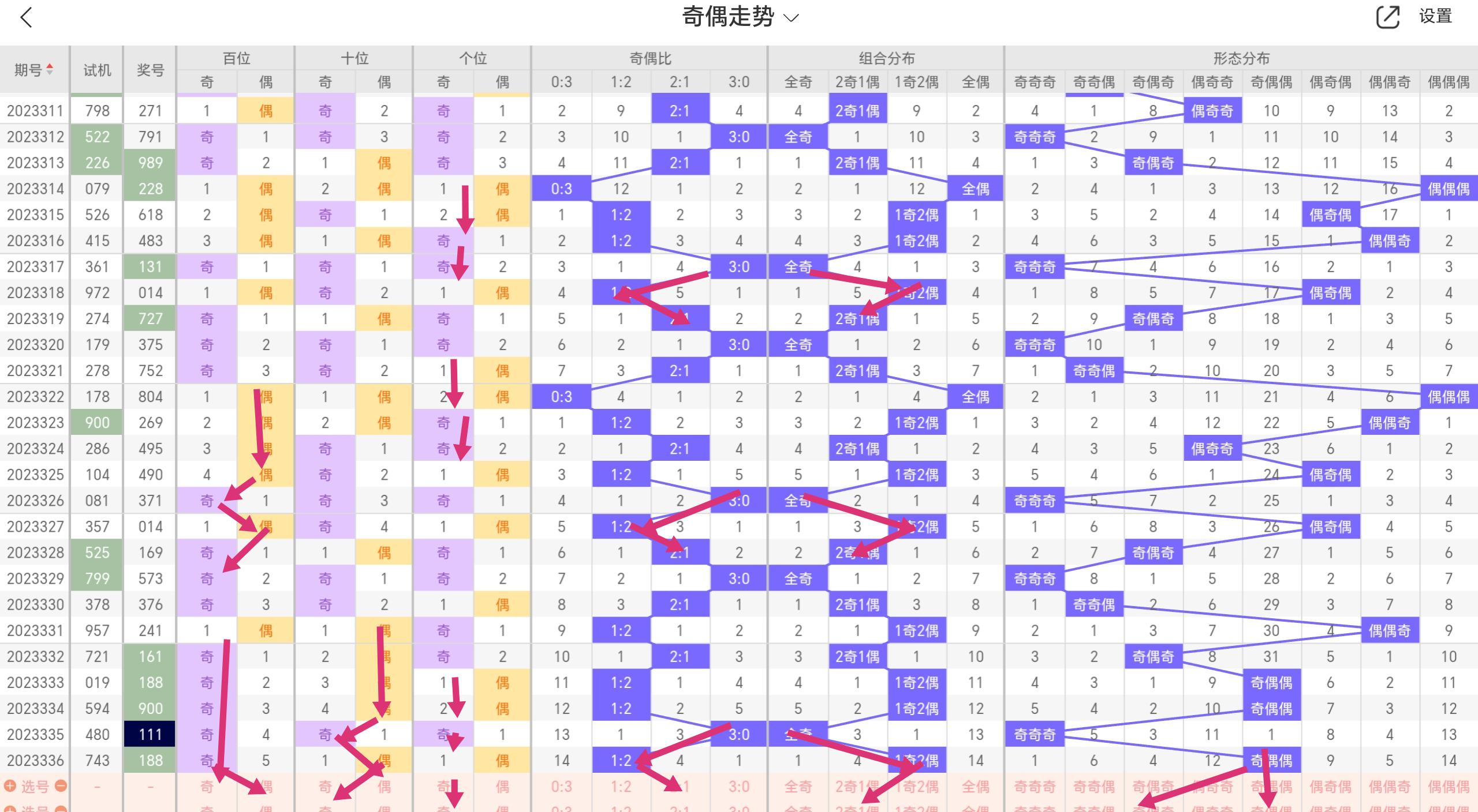 本期奇偶比很可能转变为2:1或保持在1:2,组合分布很可能为1奇2偶或2奇1偶,形态分布可能为奇偶奇、奇偶偶。百位很可能为偶数,十位很可能为奇数,个位可能为奇数。所以形态分布也有可能是偶奇奇。如下图所示: