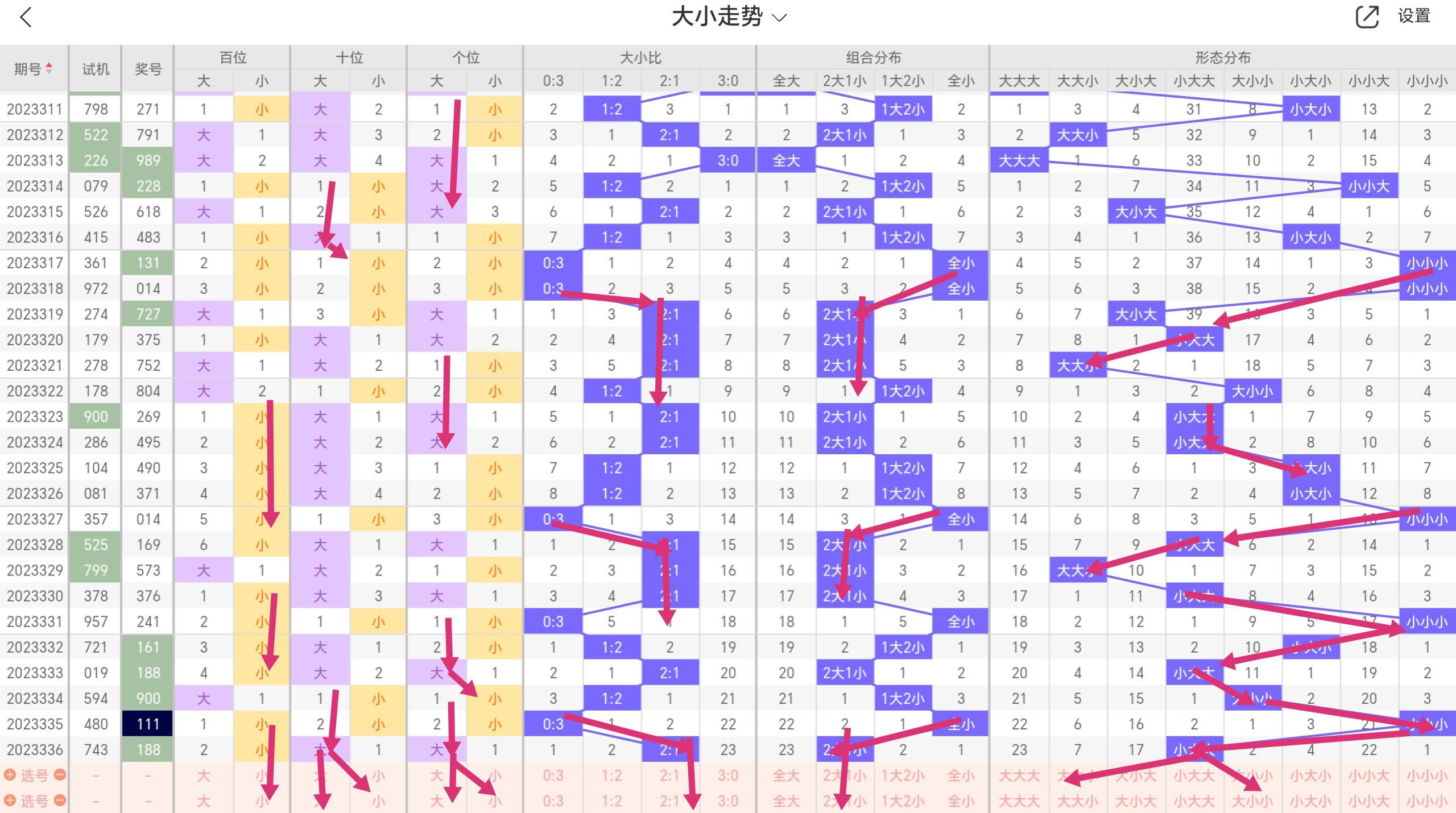 本期号码大小比很可能有一定可能会继续持续保持2:1;大小组合分布可能为2大1小,或保持全大;形态分布可能为大大小、大小小。