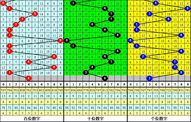 百位分析:百位上期开出号码1,历史上该位号码1出现了784次,最近100期号码1出现次,上期间隔3期再次出现。
