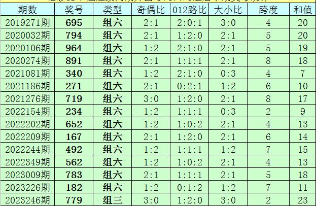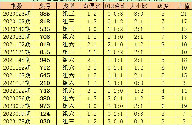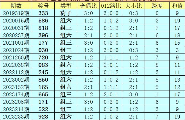 上期回顾:第2023340期福彩3D奖号为138,奖号特征为:组六,奇偶比2:1,012路比1:1:1,大小比1:2。