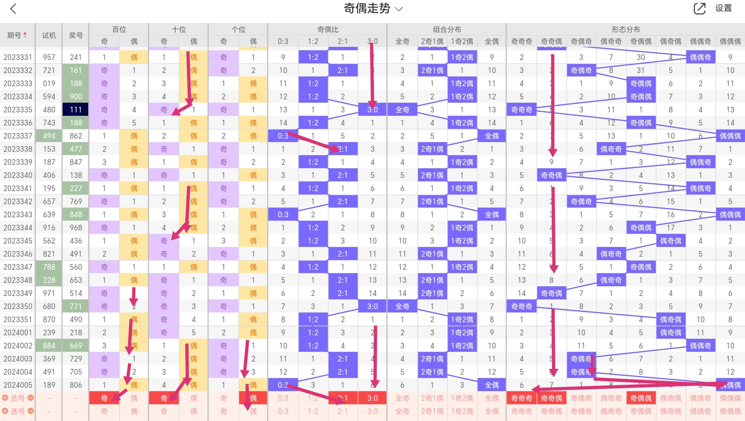 本期奇偶比很可能转变为2:1或3:0,组合分布很可能为2奇1偶或全奇,形态分布可能为奇奇奇、奇奇偶、奇偶偶。百位很可能为奇数,十位很可能为奇数,个位可能为偶数。所以形态分布很有可能是奇奇偶。如下图所示: