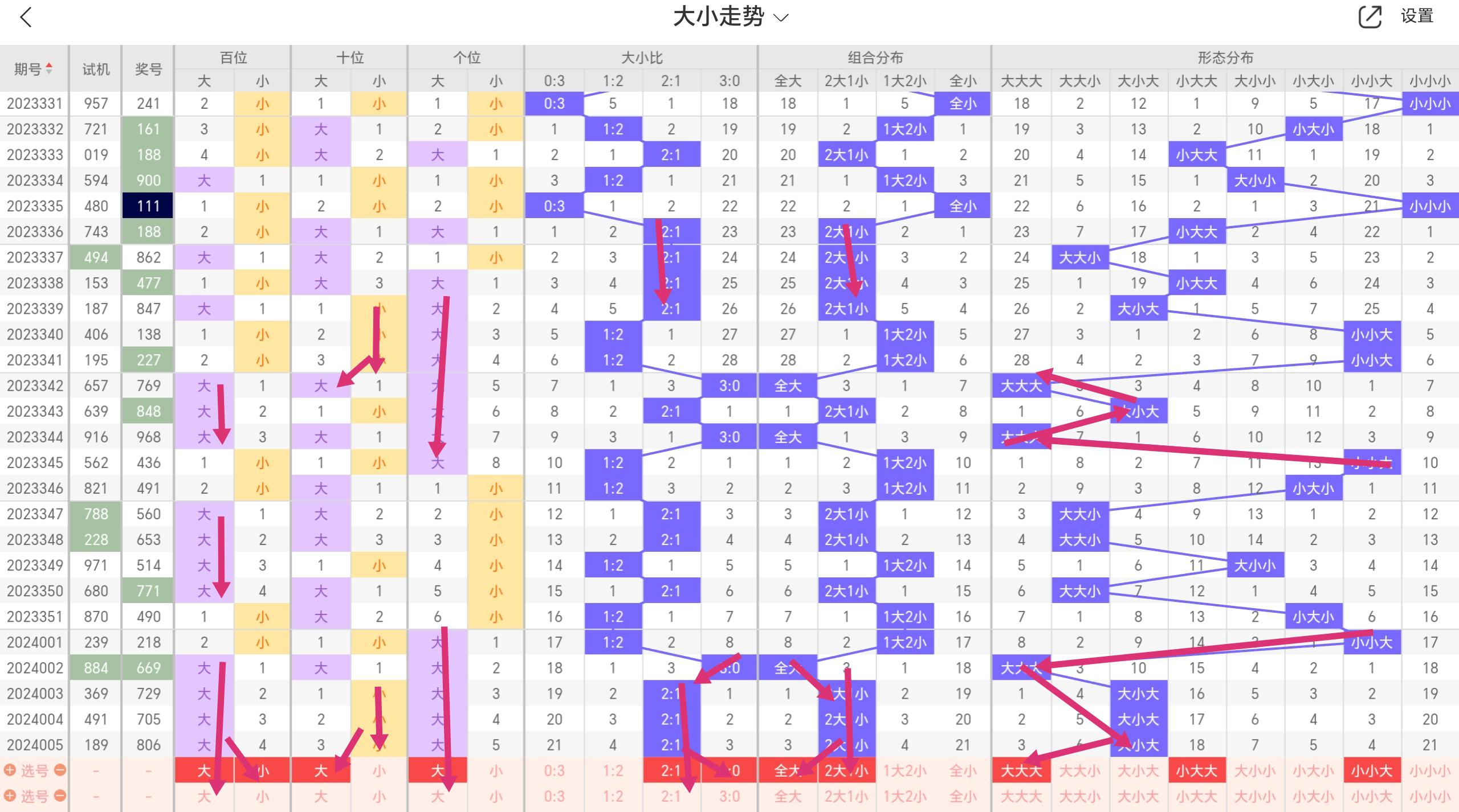 本期号码大小比很可能有一定可能会继续保持2:1或变为3:0;大小组合分布可能为2大1小或全大;形态分布可能为大大大、小大大、小小大。