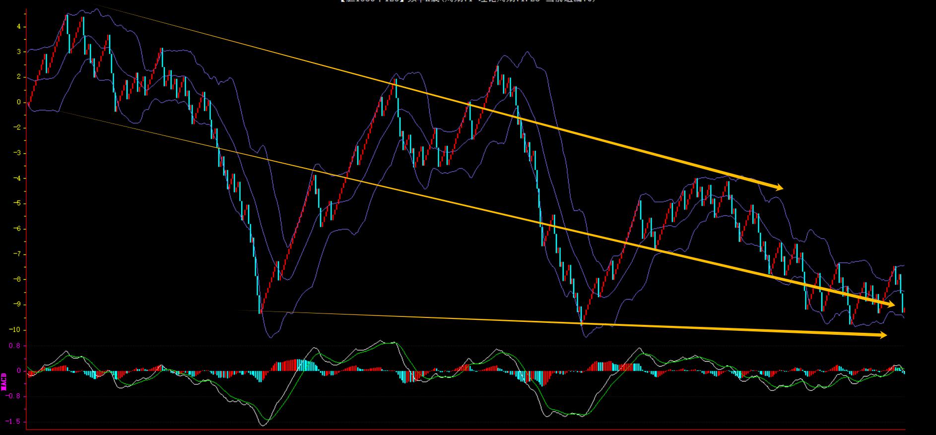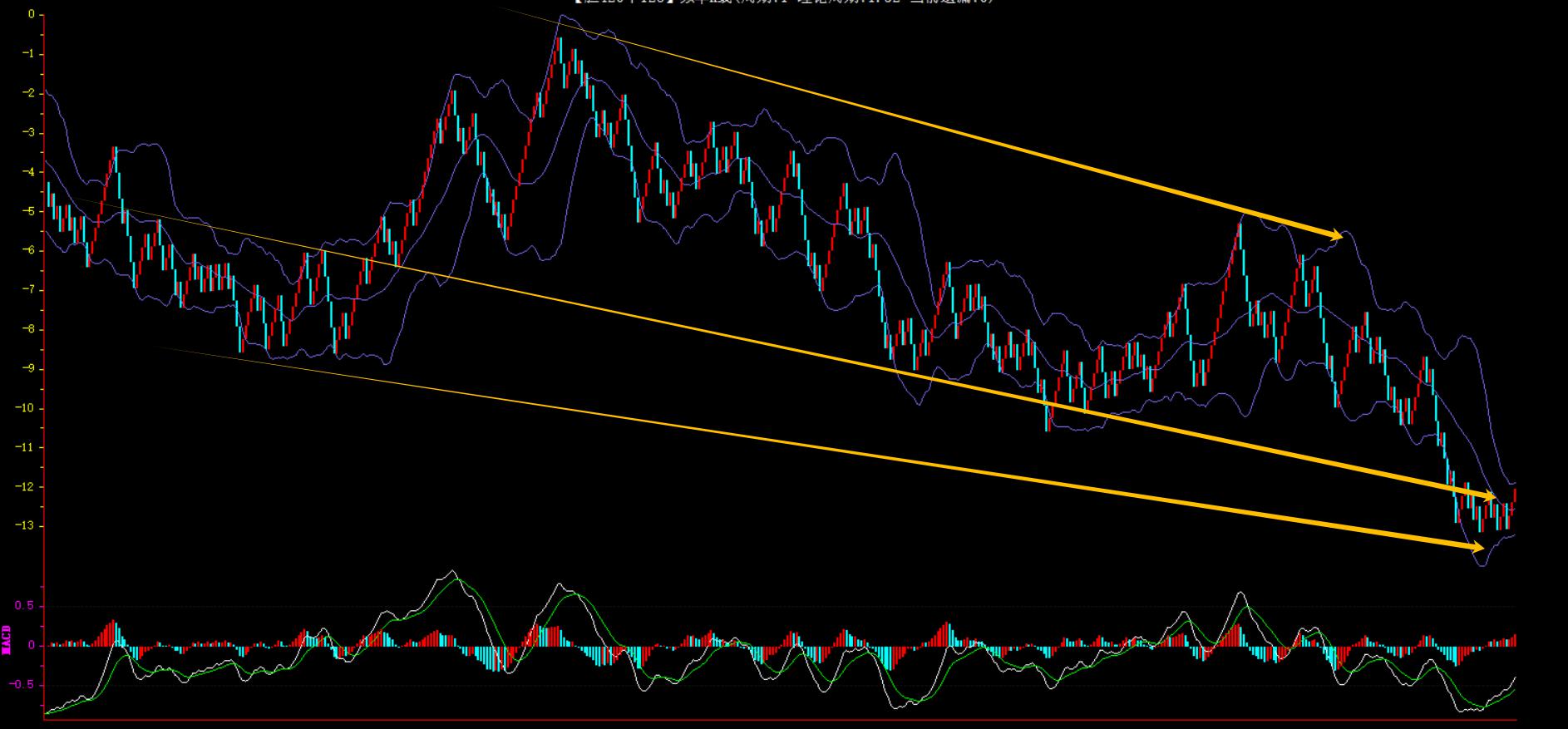 整体趋势下行,上边沿线趋势向下,下边沿趋势也是向下,节点震荡,当前开1期,本期防守。