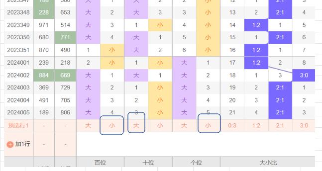 2:如图所示,2大一小走势.个位的走势已连出5大,十位已连出3小,百位已连出4大.比例为2:1.本期给出的推测还是两小一大.个位小码:01234.十位大码:56789,百位小码:01234.这是给出的范围.下面通过其他走势缩小范围.