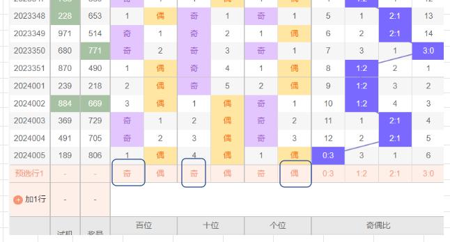 3:如图所示数据,上期开出三个偶,个位为偶,连开1期.十位为偶,连开4期.百位为偶,连开1期.比例0:3.本期推测2奇1偶,个位为偶,24680.十位为奇,13579,百位为奇,14579.结合下大小分析进行缩小,