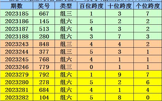 第2023279-第2023281期奖号:792、278、684,其下期奖号为:104,首位号码跨度为5;
