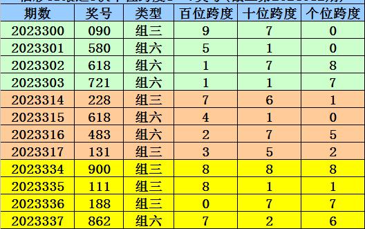 第2023334-第2023336期奖号:900、111、188,其下期奖号为:862,中位号码跨度为7;