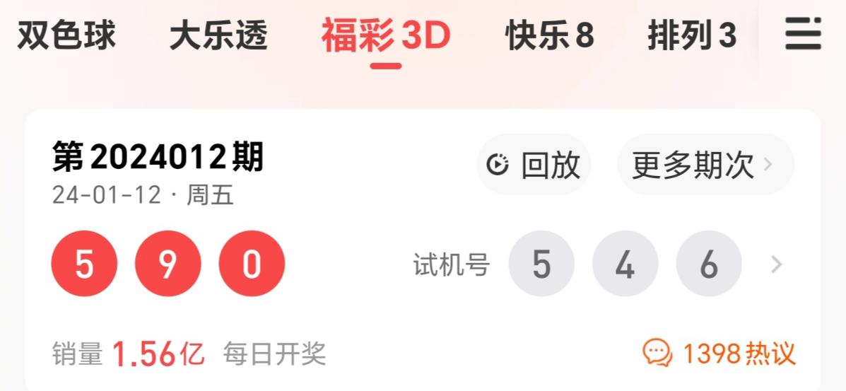 >首先我们来回顾一下福彩3D第012期的开奖号码结果:590