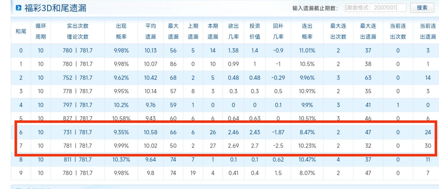 5.和尾遗漏情况:目前最大遗漏为7尾,遗漏为27期,历史最大遗漏为50期,平均遗漏10期。