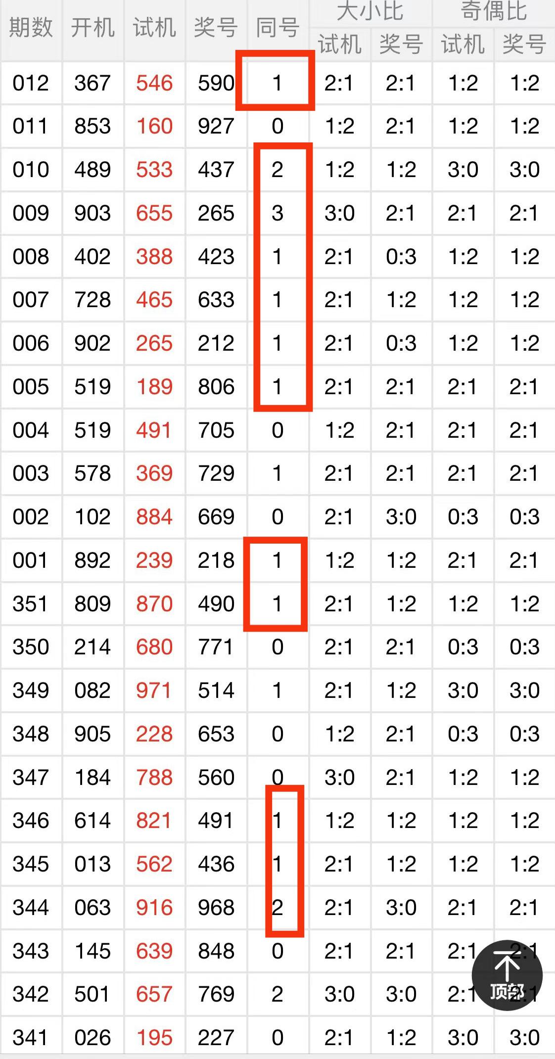 3.通杀还可以利用开奖号以及试机号,这两个一般一期最多重复一码,我们确定其中一码之后就可以排除另外两码,达到杀号的效果。时机号18时左右更新,大家结合试机号自行参考。