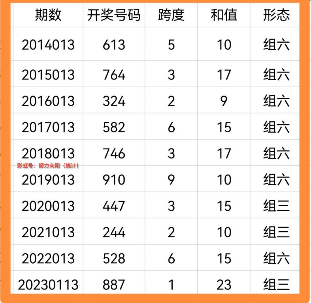 >一:依据往年十期号码,我们先来分析三位出号范围以及跨度和值范围: