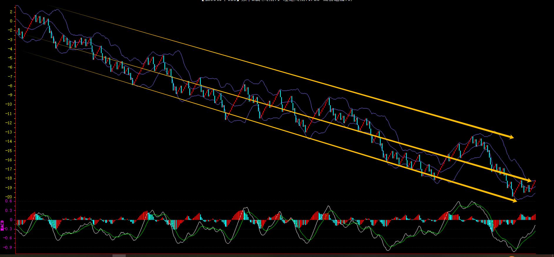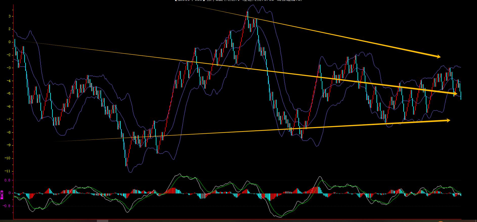 整体趋势下行,上边沿线趋势向下,下边沿趋势向上,节点震荡,当前遗漏2期,本期防守。