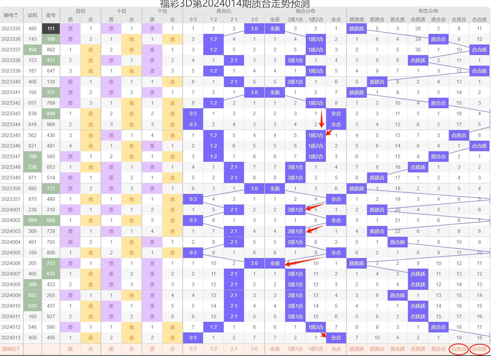 往期十期的质合数如下:第2023350期为全质,第2023351期为全合,第2024001期为两质一合,第2024002期为全合,第2024003期为两质一合,第2024004期为两质一合,第2024005期为全合,第2024006期为全质,第2024007期为两质一合,第2024008期为两质一合,第2024009期为两质一合,第2024010期为两质一合,第2024011期为两质一合,第2024012期为一质两合,第2024013期为全合。