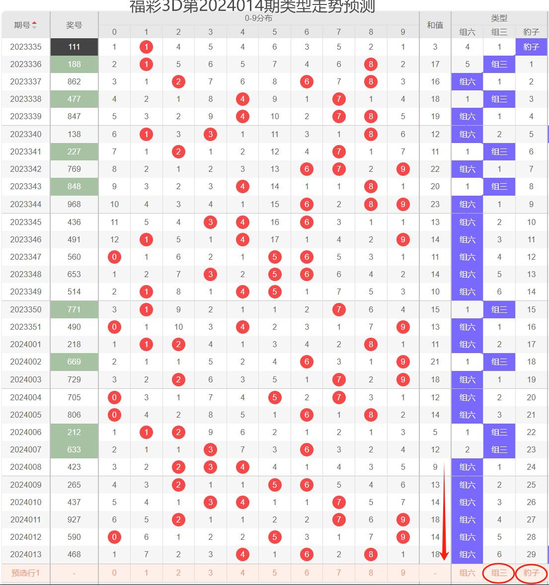 通过类型走势分析,本期形态为组六,防组三,2023年1月11日出现豹子形态,近期可以关注豹子形态。