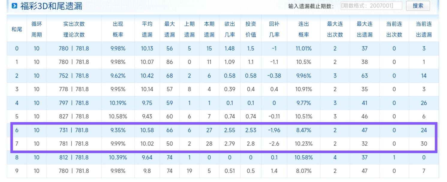 5.和尾遗漏情况:目前最大遗漏为7尾,遗漏为28期,历史最大遗漏为50期,平均遗漏10期。