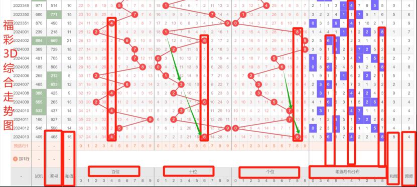 福彩3D第2024013期开奖号码为468,形态为组六,奇偶比0:3,和值18,跨度4,大小比:2:1,【012路个数比】:1:1:1。