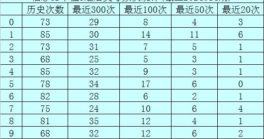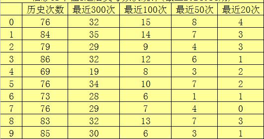 个位杀号:上期个位奖号为1,历史上个位奖号1共开出788次,最近100次个位奖号1出现时,其下期号码0-9开出次数分别为:奖号0开出15次,1开出14次,8开出13次,3开出12次,5开出10次,2开出9次,4开出8次,7开出7次,6、9开出6次。