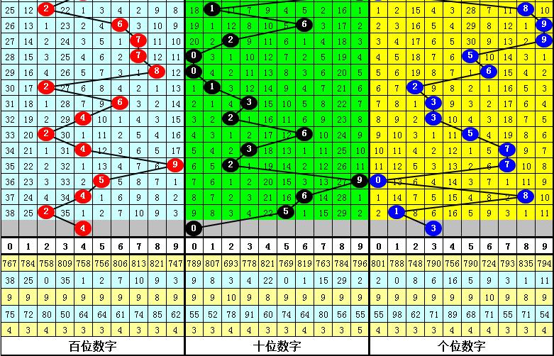 前三次百位号码2出现之后,其下期奖号分别开出:6、6、4,出现在:高频区域、高频区域、低频区域,本期百位排除高频区域号码,绝杀5码:02367。