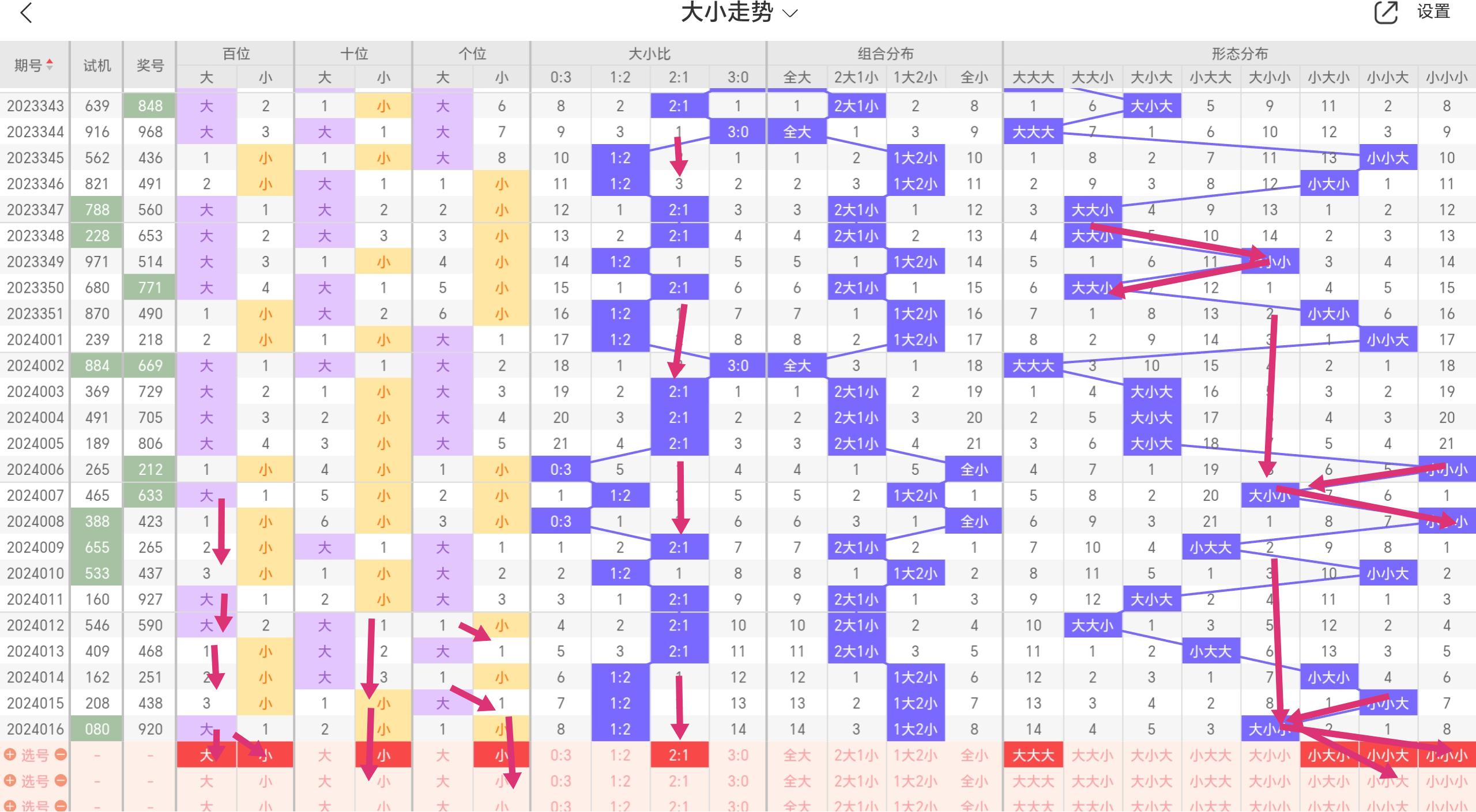 本期号码大小比很可能会转变为2:1或保持1:2;大小组合分布可能为1大2小或全大;形态分布可能为大大大、小大小、小小大、小小小。