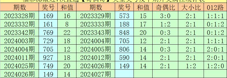 前7次出现奇偶奇类型奖号分别为:169、161、769、729、705、927、749,其下期分别开出奖号:573、188、848、705、806、590、149。