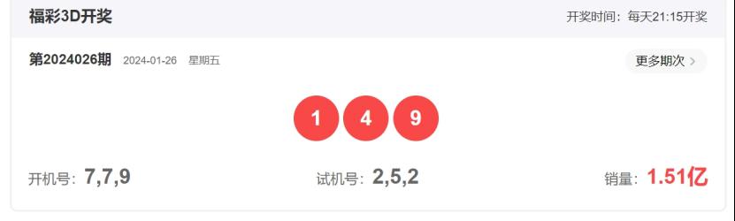 福彩3D第2024026期开奖号码为149,形态为组六,奇偶比2:1,和值14,跨度8,大小比:1:2,【012路个数比】:1:2:0。