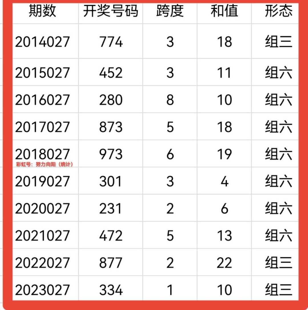 一:依据往年十期号码,我们先来分析三位出号范围以及跨度和值范围: