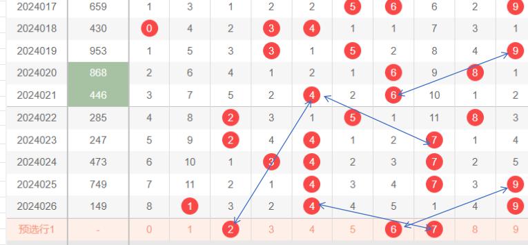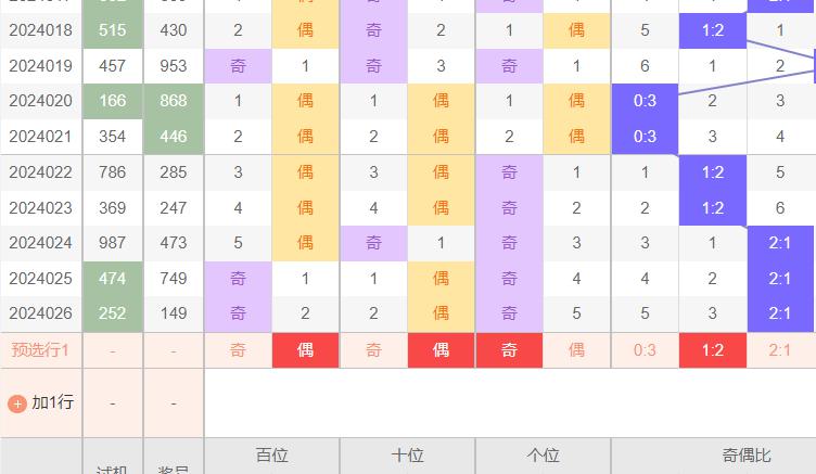 3:如图所示数据,上期开出两奇一偶,个位为奇,连开5期.十位为偶,连开2期.百位为奇,连开2期.比例2:1.本期推测1奇2偶,个位为奇,13579.十位为偶,24680,百位为偶,02468.结合下大小分析进行缩小,