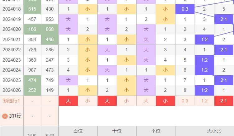 2:如图所示,1大2小走势.个位的走势已连出2大,十位已连出2小,百位已出1小.比例为1:2.本期给出的推测还是两大一小.个位小码:01234.十位大码:56789,百位大码:56789.这是给出的范围.下面通过其他走势缩小范围.