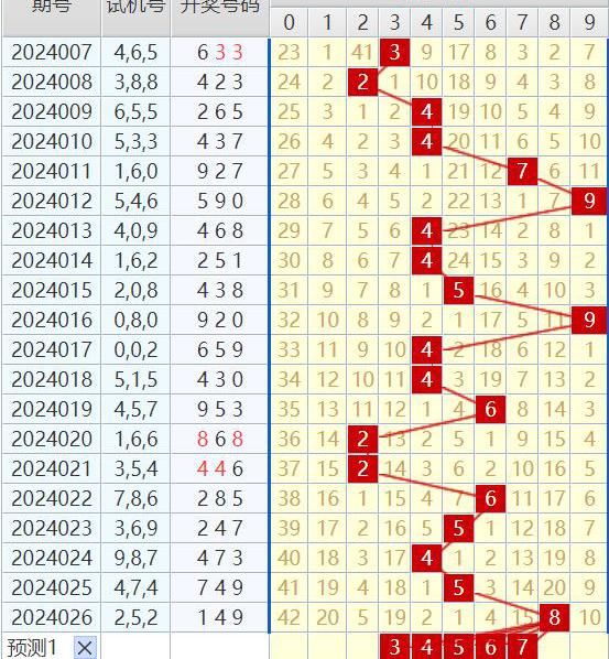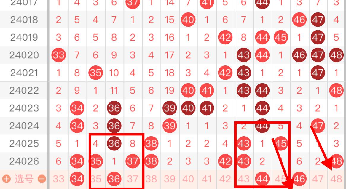 第三区间上期开出了7个号码,34 35 37 38 42 43三组姐妹号为本期号码奠定了基础,本期大概率要走温热走势,重点可以放在这三组姐妹号的重复号码和边号上,夹号也很关键,36菱形走势以及44对称走势是很不错的,可以考虑!
