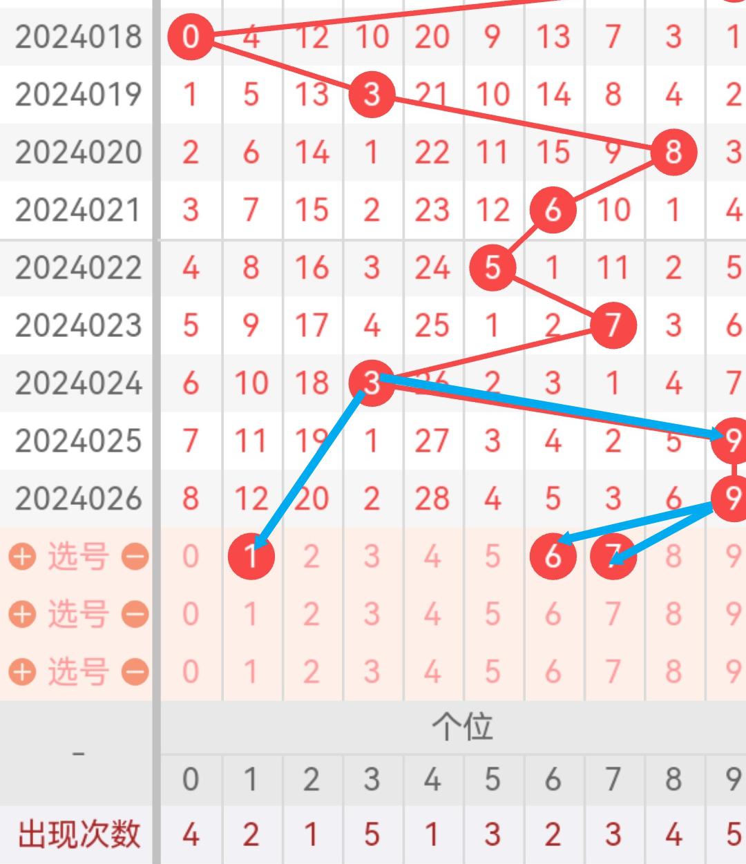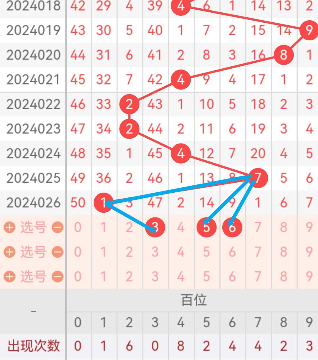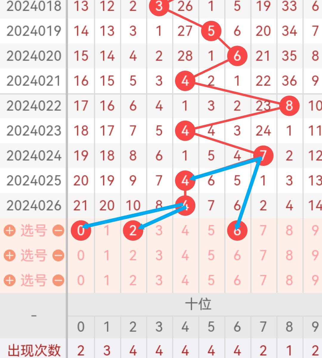 现在我给大家分析下,本期十位可能开出的号吗,上期开出了4,根据走势图我们可以看到,018期开出了3号码球,019期开出了5号码球,020期开出了6号码球,021期开出了4号码球,023期开出了4,024期开出了7号码球,025期开出了4号码球,026期开出了4号码球,根据这几期的走势和历史30期内的走势对比,我们可以先考虑本期可能会出小号,下面我给大家推存十位可能开出的几个号,个人比较看好026,十位我们就先暂定这两个号。本期重点关注0-6之间的号码,同时关注遗漏期数较小的号码。按最近遗漏走势,开了遗漏期数较大之后开遗漏期数小的可能性比较大。