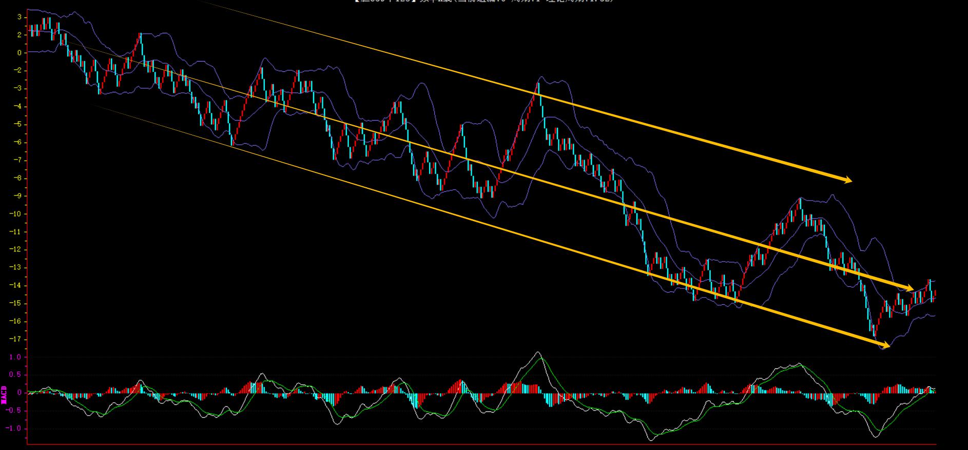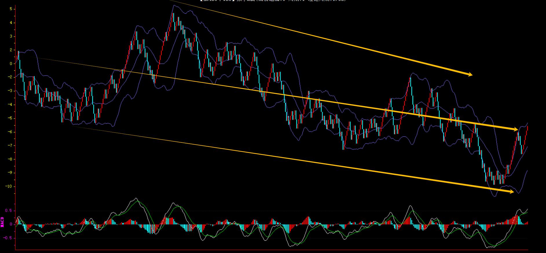 整体趋势下行,上边沿线趋势向下,下边沿趋势也是向下,节点震荡,当前连开2期,本期防守。