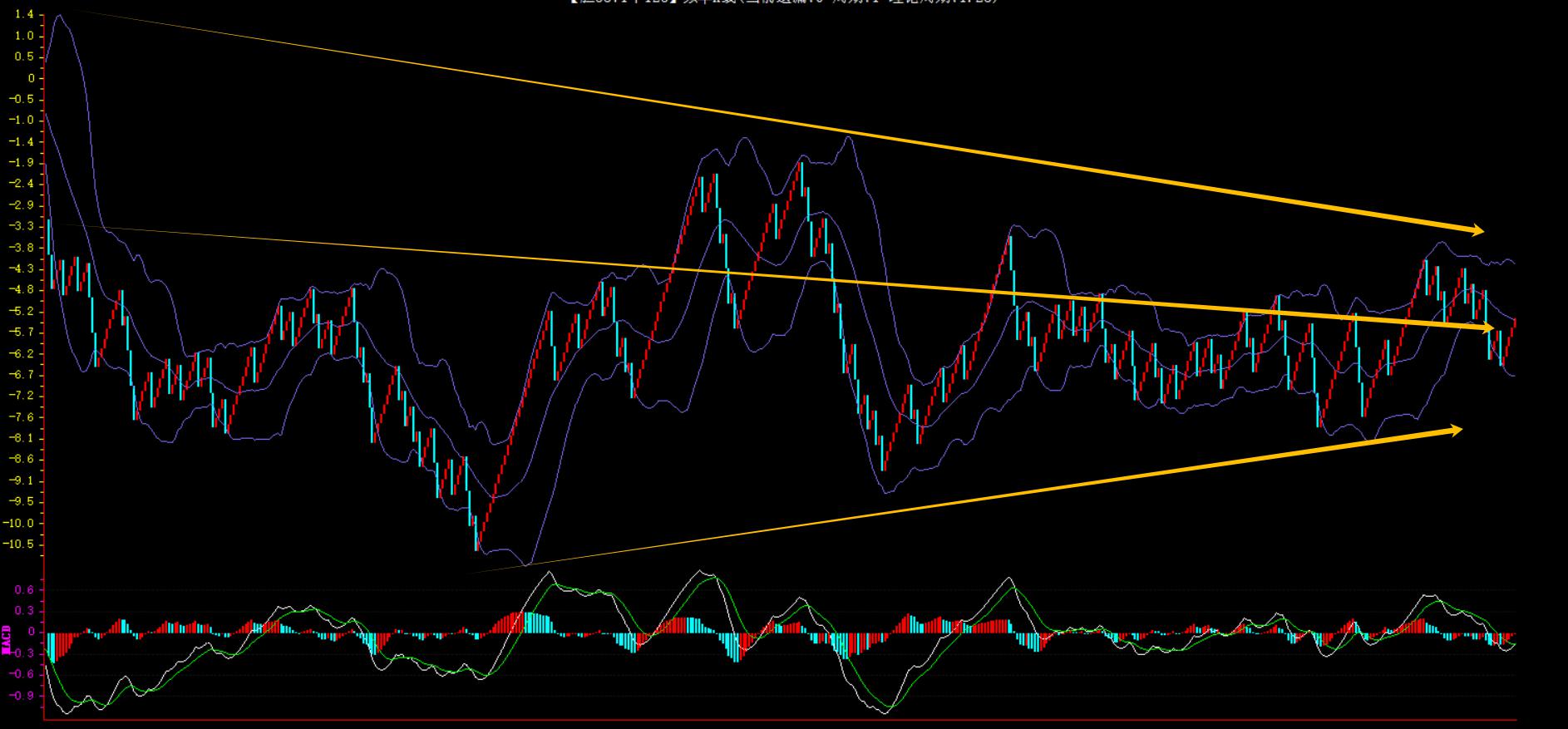 整体趋势下行,上边沿线趋势向下,下边沿趋势向上,节点震荡,当前连开5期,本期防守。