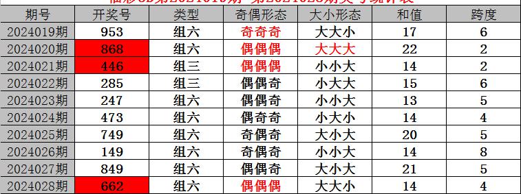 上期回顾:福利彩票3D第2024028期开奖结果662。奖号:偶偶偶、大大小,和值14,跨度4。