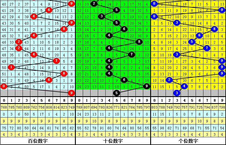 百位分析:百位上期开出号码0,历史上该位号码0出现了768次,最近100期号码0出现次,上期间隔52期再次出现。