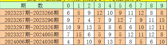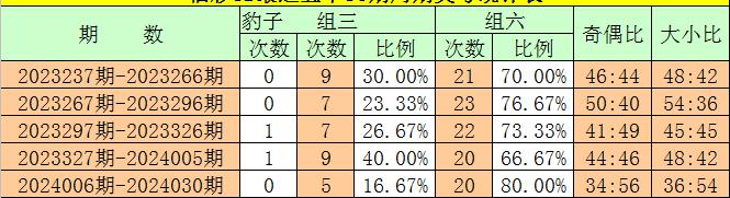 类型分析:福彩3D在上一个30期周期内(第2023327期-第2024005期),组三(含豹子)组合出现了10次,占开奖总数的33%,组六号码出现20期,出现比例为67%,其中组六号码开出比例明显较高。