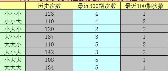 二、最近7次【大小大】奖号之后,其下期分别开出号码:968、705、806、212、590、149、662,其中组三号码出现2次,组六号码出现5次。本期预计开出组六号码。