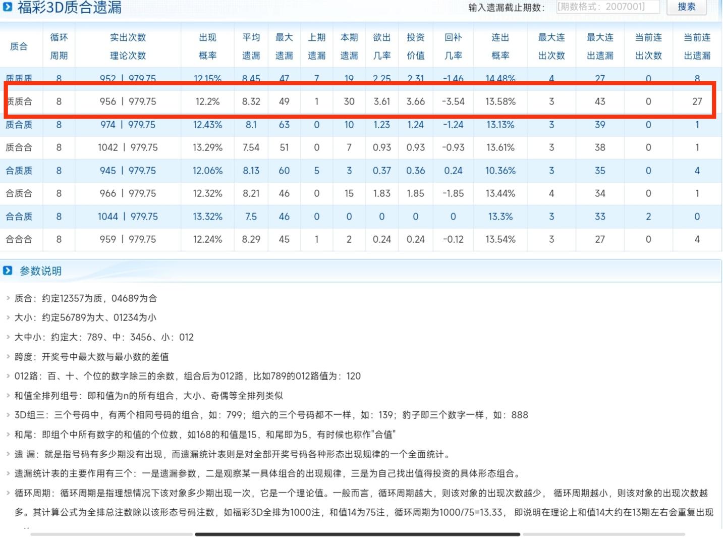 3.质合遗漏情况:目前最大为质质合,遗漏30期,历史最大遗漏49期,平均遗漏为8.3期。