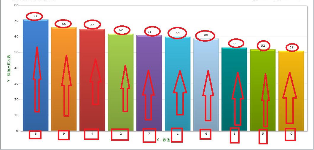 1.号码分别为:8,9,4,2,7,1,6,3,5,0。号码的冷热分布通过统计最近200期的开奖结果计算得出,数字越大表示号码越热,反之则表示号码较冷。
