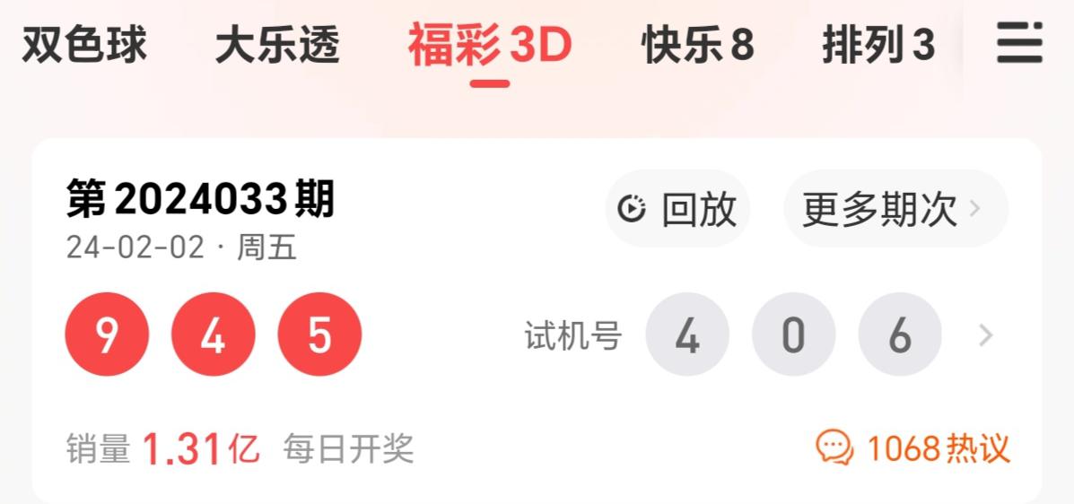 >首先我们来回顾一下福彩3D第033期的开奖号码结果:945