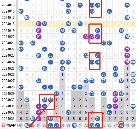 上期四区间开出了4个奖号(63.64.66.74)上期的四区开出了4个奖号,上期的7头还是回补了一个奖号6头开出了三个奖号,本期我们先来看62号球这里的大连号一区的斜连都能开出来四区的大斜连我们也是可以防守的,66.67号球就是我们上期防守的两个号码也是上期还不是时候本期我们再来防守这两个号码,那么70号球这个冷号我们也是可以适当的防守一期的,73.74号球这两码之间的搭配度还是很高的一定要注意防守,再来就是78号球也是和70号球一样是个冷号注意这两个号码的抉择。