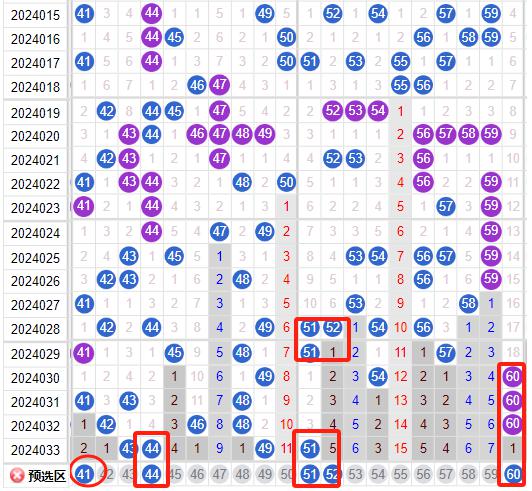 上期三区间开出了4个奖号(43.44.49.51.)上期回顾三区开出了4个奖号,那么5头在断掉两期后在上期进行了一个号码的回补本期我们可以适当的增加两码的回补形态,我们先来看41号球这里近期的走势还是比较稳的注意防守,44号球的重号这我们要注意防守本期这样的走势我个人防守的还是挺多的,那么后面的51,52号球也是复制了上面的一个走势也就是所谓的二连号我们要注意防守,后面的60号球隔期回补号这里的防守肯定是要做的。