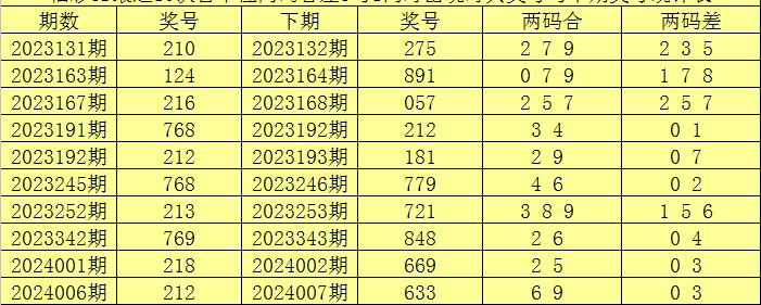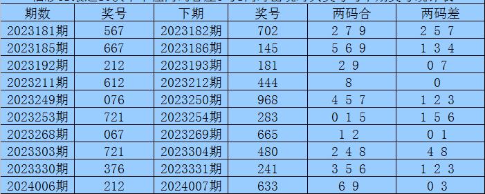 百十位合差分析:上期奖号百十位开出67组合,两码合为3,两码差为1,最近10次百十位两码合3与两码差1同时出现时,其奖号和下期奖号分别为: