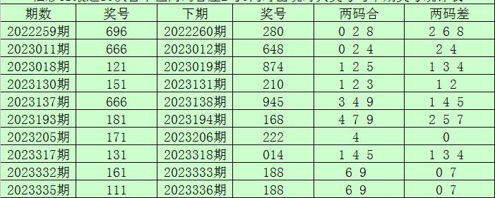 百个位合差分析:上期奖号百个位开出66组合,两码合为2,两码差为0,最近10次百个位两码合2与两码差0同时出现时,其奖号和下期奖号分别为: