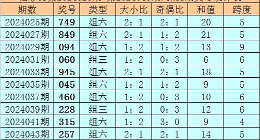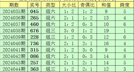 其中大小比1:2,奇偶比2:1,和值12,跨度3。
