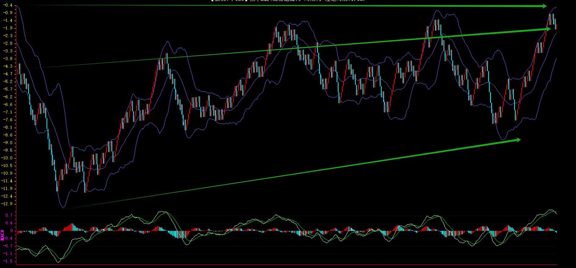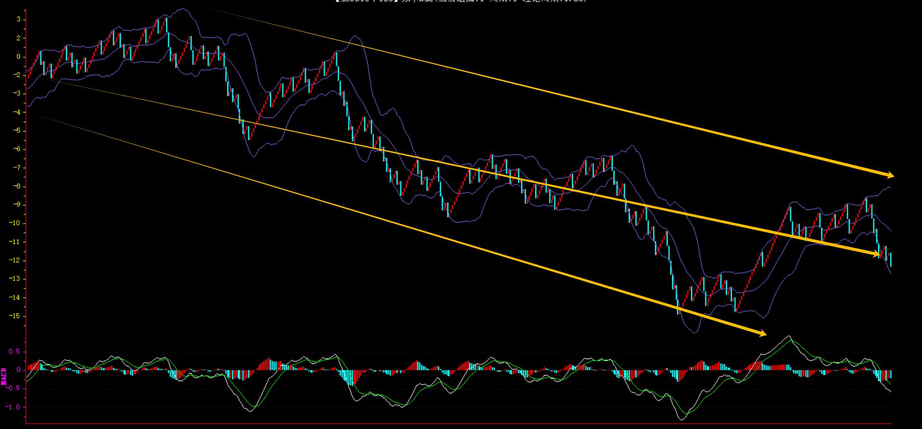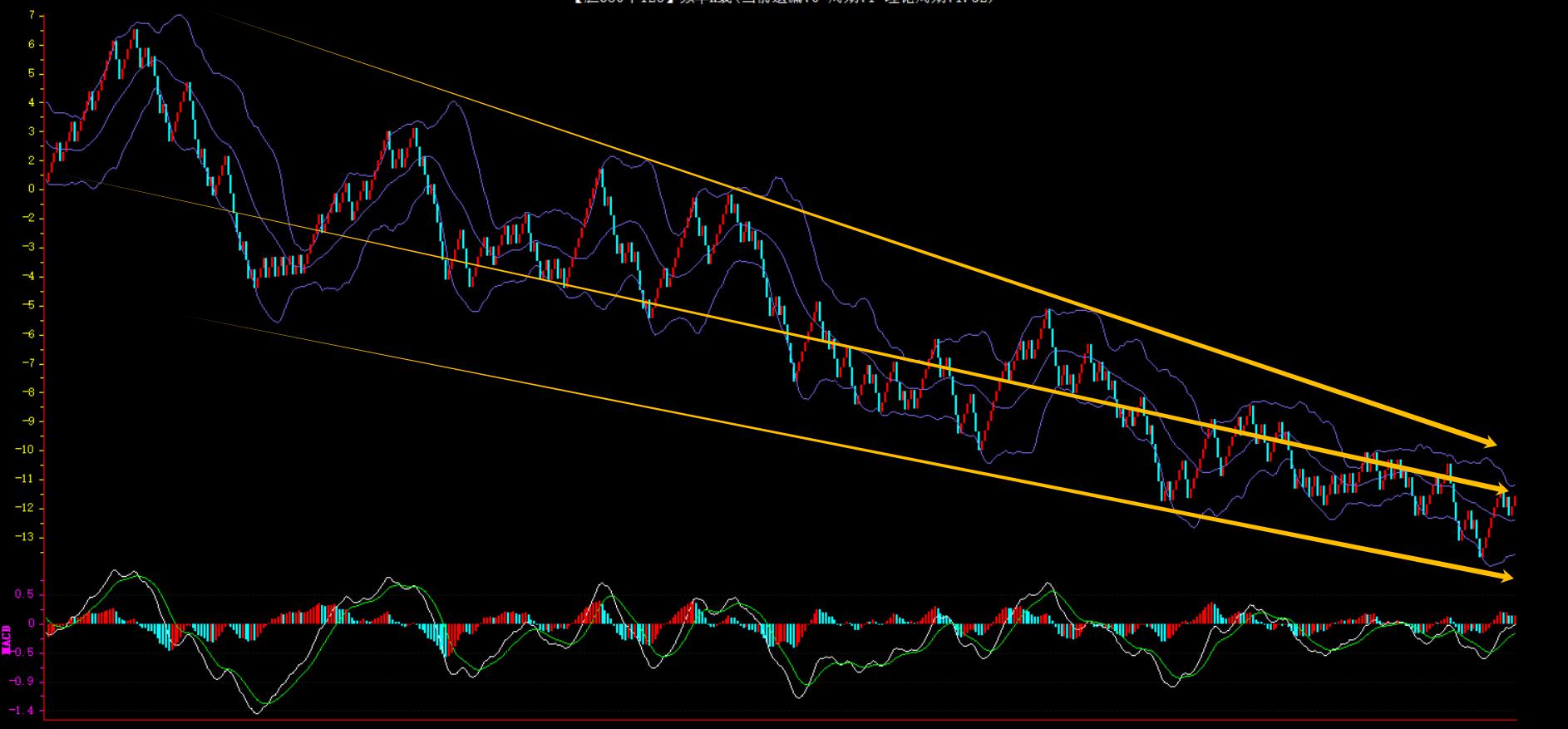 整体趋势下行,上边沿线趋势向下,下边沿趋势也是向下,节点震荡,当前遗漏1期,本期防守。