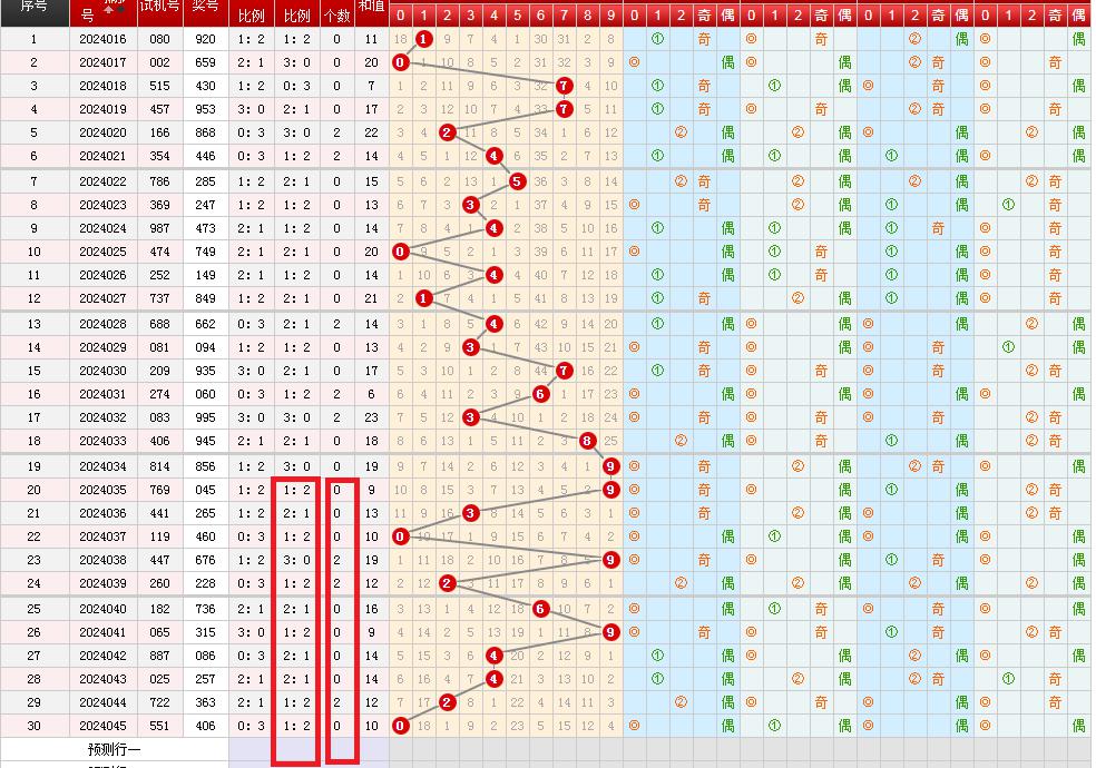 近30期分别开出14期和值奇,16期和值偶,和值奇偶大致均衡。近5期开出1期和值奇,1期和值偶。上期开出和值偶,按近期跟随表现,本期和值奇偶难定。